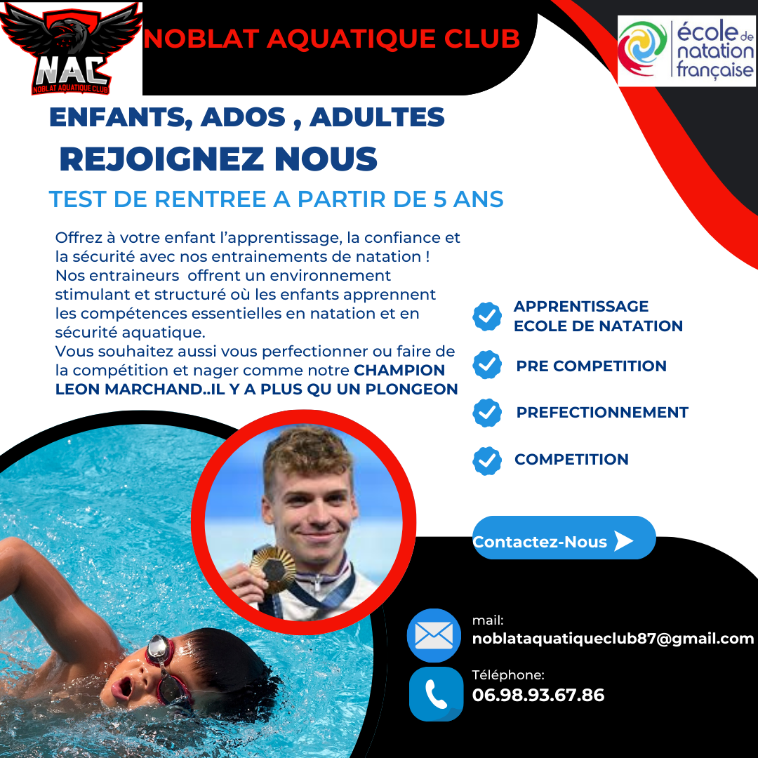 POUR TOUT RENSEIGNEMENT VOUS POUVEZ NOUS CONTACTER par mail: noblataquatiqueclub87@gmail.com ou 06.98.93.67.86