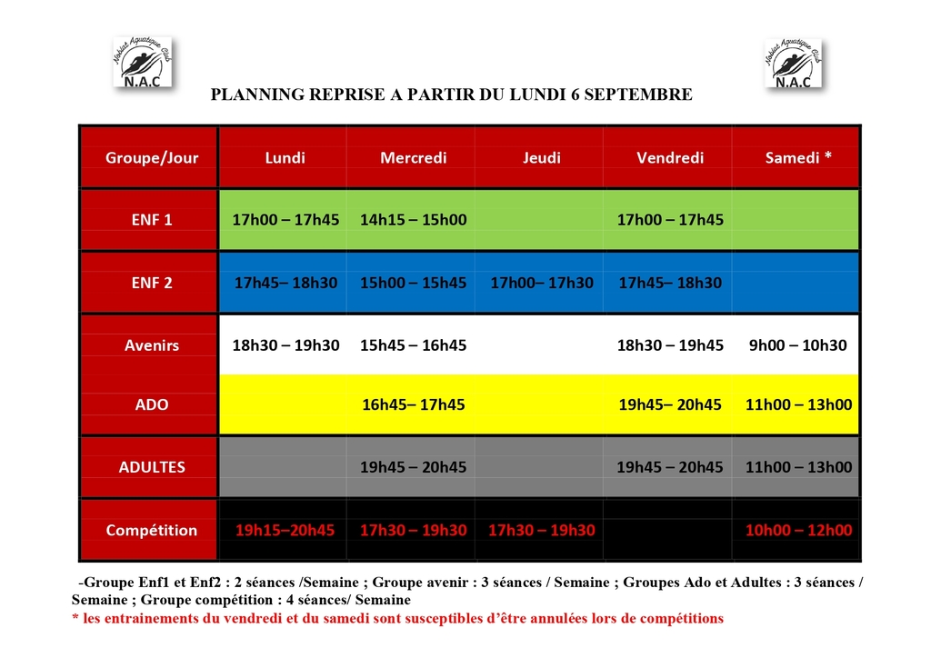 Merci de prendre connaissance du planning et de vous rapprochez de l'entraineur pour vos groupes et créneaux.
